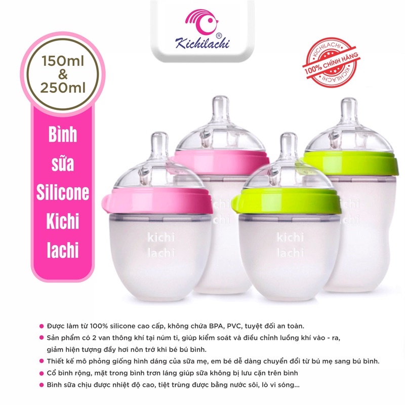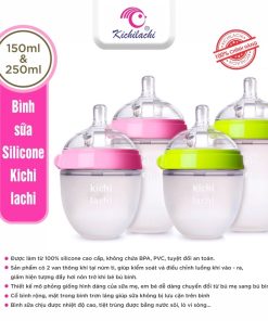 – Bình sữa Kichilachi Baby Bottle 150ml và 250ml có thân bình và núm ty được làm bằng 100% chất liệu silicon.