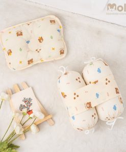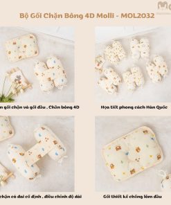 Chất liệu: vỏ ngoài là vải sợi tre không nhăn, bên trong là lớp bông vi sinh mềm mại và thấm hút mồ hôi, hạn chế việc ra mồ hôi trộm của bé. Theo khuyến cáo từ các nhà sản xuất, cách sử dụng gối chặn cho bé đúng là: Đặt gối chặn xuống giường hoặc cũi trước. Sau đó đặt lên trên phần vải giữa hai chiếc gối dài, hai chiếc gối sẽ ôm chặn hai bên để cố định trẻ ở một tư thế, tránh làm bé giật mình. Điểm khác biệt của dòng sản phẩm đó là thiết kế vô cùng thông minh với phần lõm ở giữa giúp hạn chế tối đa tình trạng méo đầu ở trẻ nhỏ do nằm sai hay nằm quá lâu ở 1 tư thế. Với bộ chặn gối này sẽ giúp định vị tư thế ngủ của bé, giữ cho bé luôn nằm thẳng, tránh các dị tật về cột sống hay lật người gây ra những tình huống nguy hiểm có thể xảy ra. Đồng thời bộ chặn còn tránh cho bé bị giật mình tỉnh giấc trong khi ngủ cũng như không bị ngã khi nằm chơi 1 mình Vỏ bộ gối chặn và gối lõm đầu MOLLI làm bằng vải cotton có khả năng thấm hút tốt, không gây bí bách cho bé trong quá trình sử dụng. Ruột gối làm từ bông vi sinh tự nhiên đặc biệt rất mềm mại và an toàn với trẻ. Mẹ có thể tháo phần ruột gối chặn để vệ sinh sạch sẽ nhanh chóng. Từng chi tiết của bộ gối chặn và gối lõm đầu này đều được cắt may rất khéo léo, không nổi cộm gây khó chịu hay ngứa ngáy.