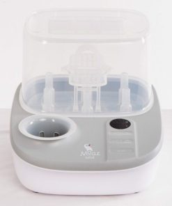 - Máy bên trái: Nắp tiệt trùng + khay đựng phụ kiện + buồng để bình sữa + giá để nồi + buồng đun: Nhựa PP; Nồi và nắp sứ: Sử; Đế đun: Thép không gỉ.