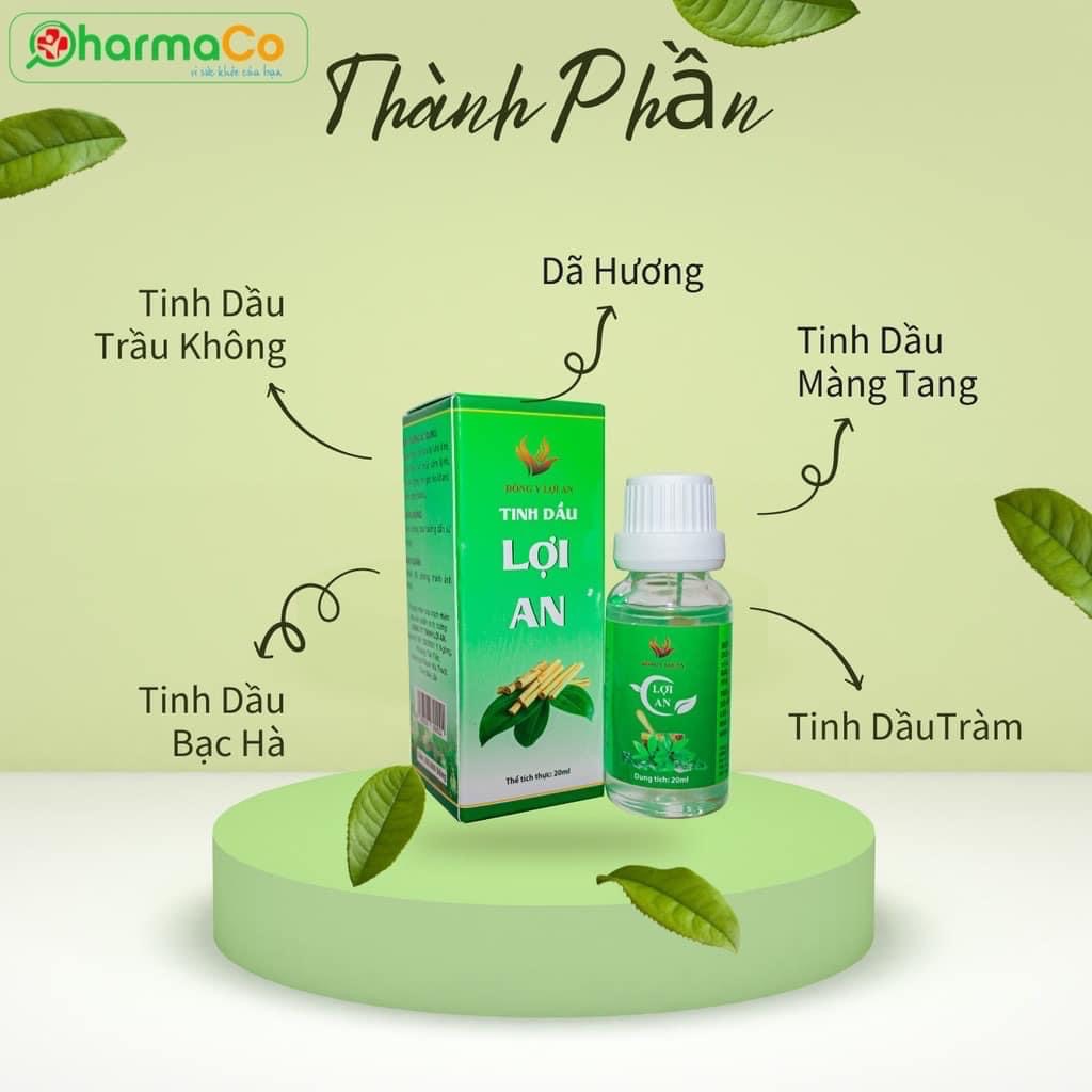 Các thành phần chính trong tinh dầu Lợi An như tinh dầu trầu khôոɡ, màng tang, quế chi, long não, tràm, dã hương, bạc hà và một số vị thuốc bí truyền khác có tác dụng rất tốt trong việc giảm ho, đàm, sổ mũi, ngăn ngừa các bệnh cảm lạnh và cảm mạo.
